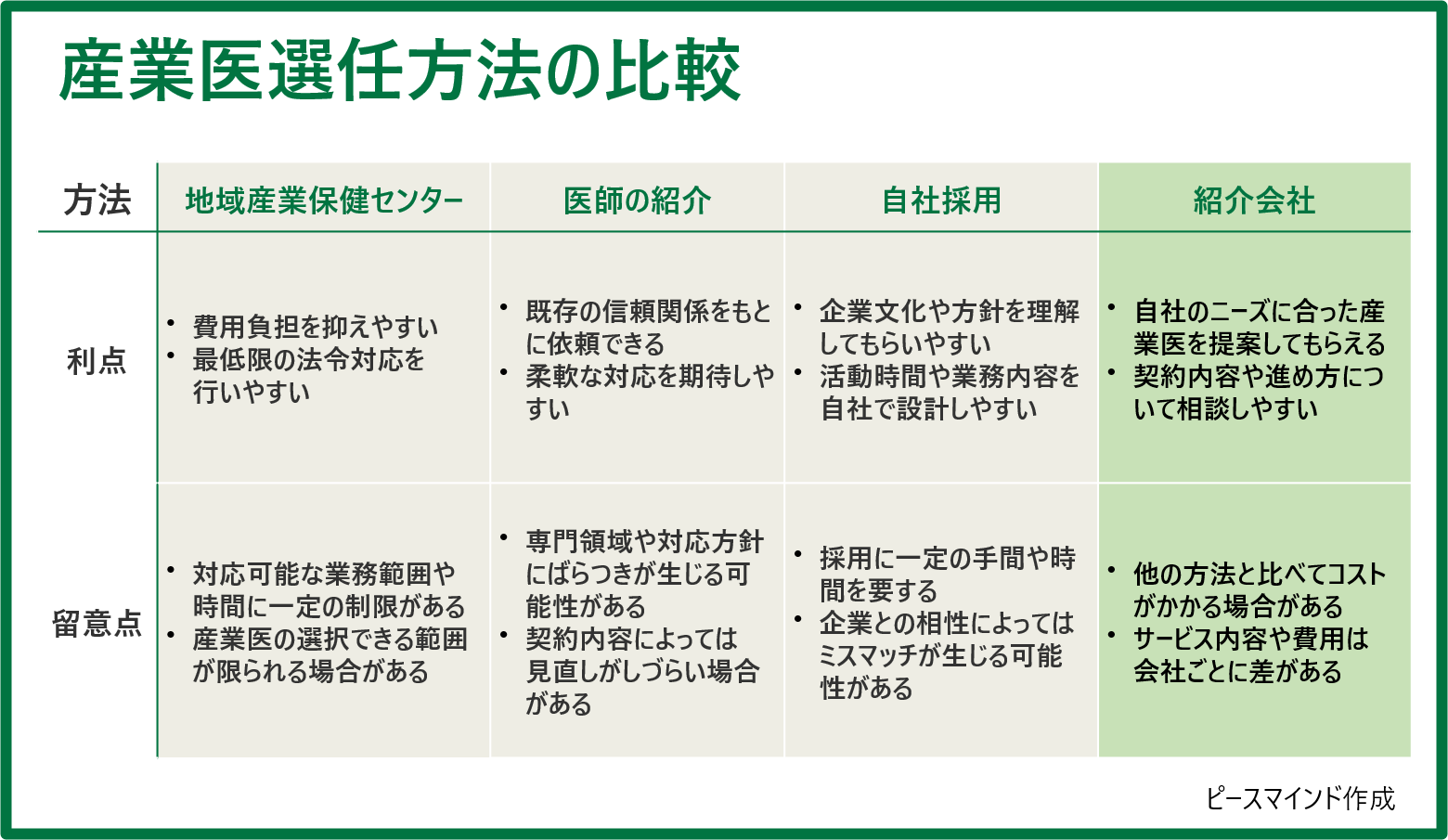 本事例を通して、産業医の選任方法にはさまざまな選択肢がある中で、紹介会社であるピースマインドを活用することで、企業に合った産業医を選任しやすくなることや、困りごとが生じた際にも相談しやすい体制を築きやすいことを感じていただけたのではないでしょうか。