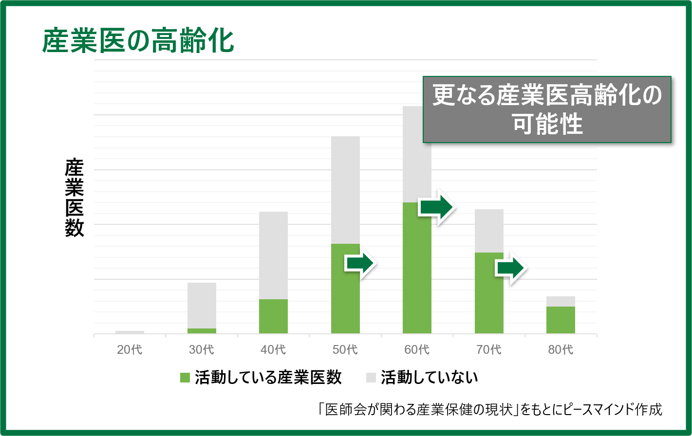 さらに、産業医として活動する人の多くはベテラン世代で、企業内で若手と呼ばれる世代は少ないのが現状です。