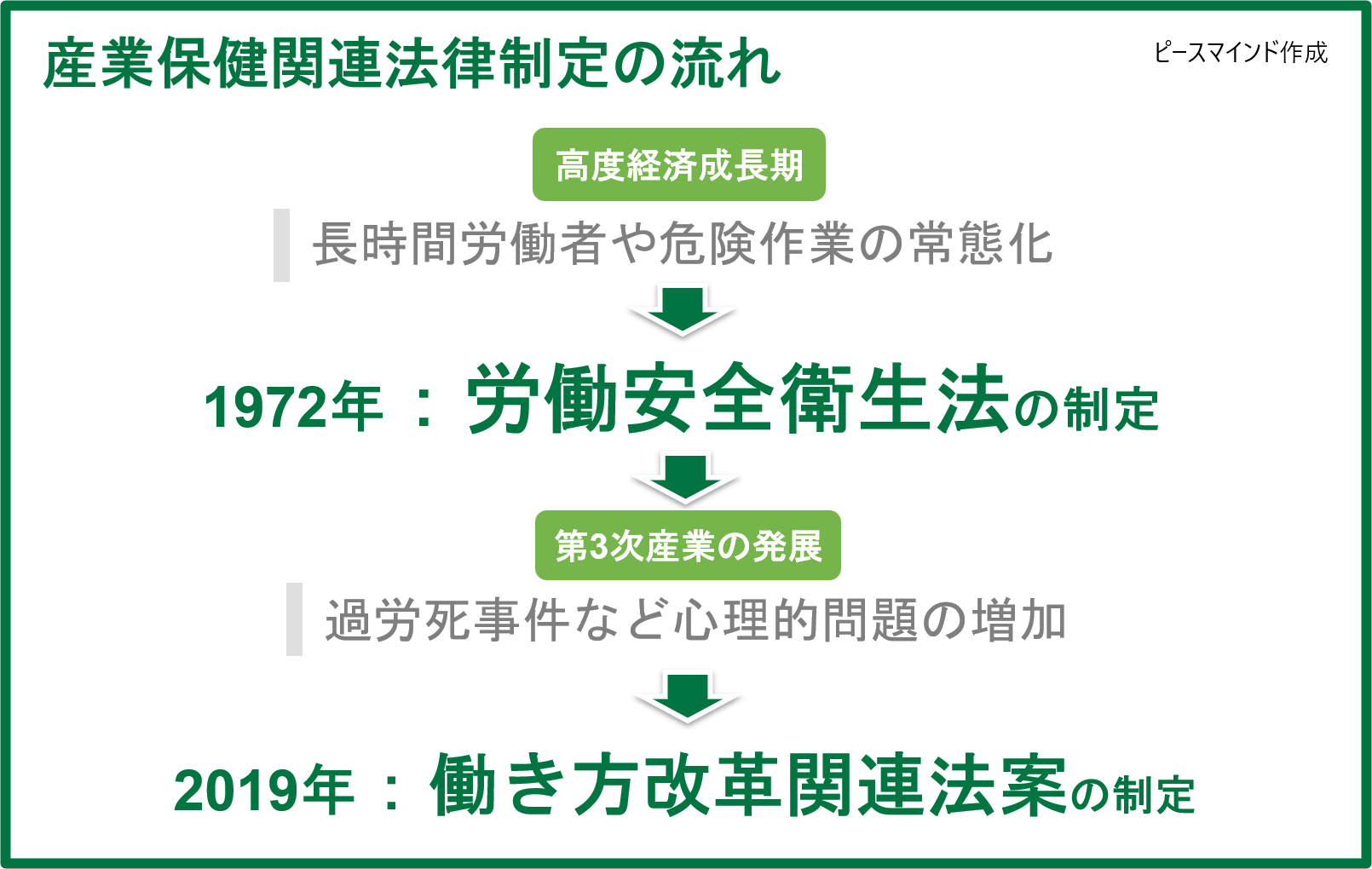 このように、労働安全衛生法の制定から社会状況や産業構造の変化により、様々な労災が発生し、その都度、法改正が行われてきました。また、この変化の中で、産業保健体制は、常に焦点が当てられました。