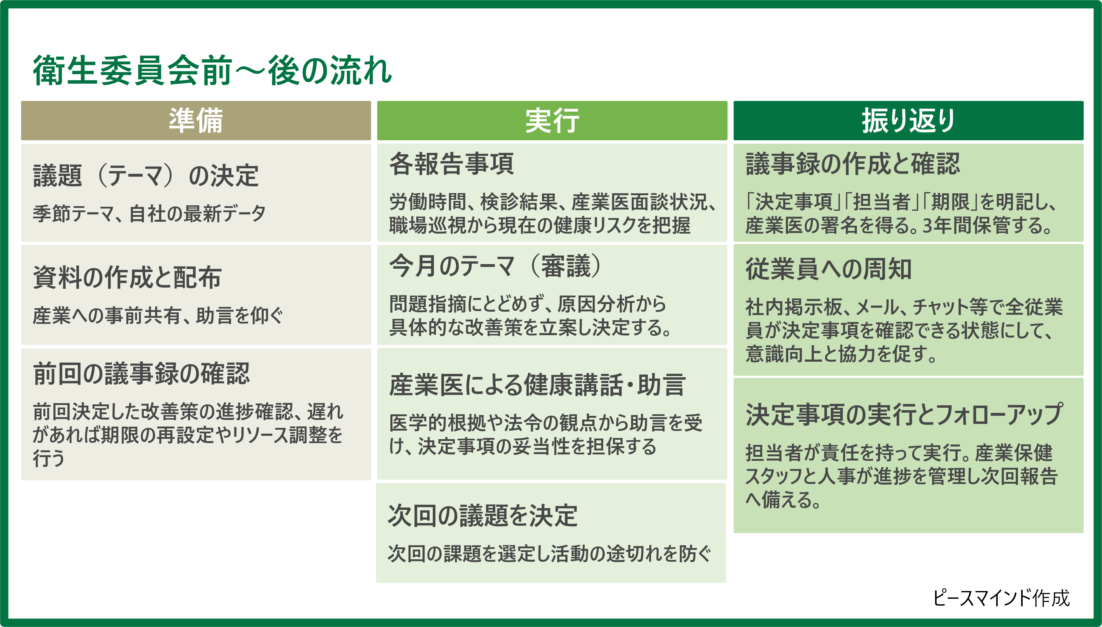 衛生委員会の活動を実効性のあるものとするためには、会議で決定した事項を実行に移し、その結果を評価する「事後措置」が不可欠です。