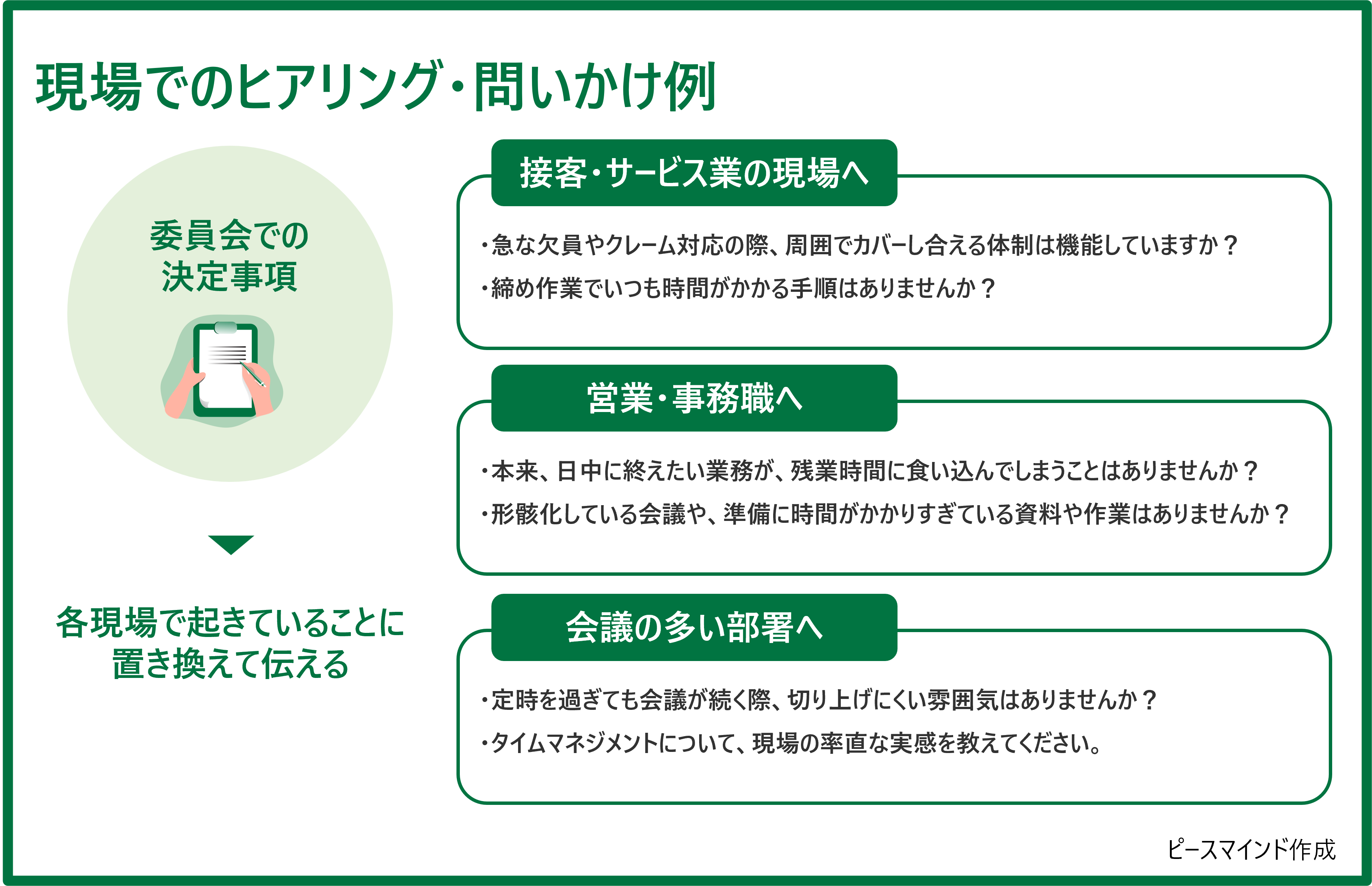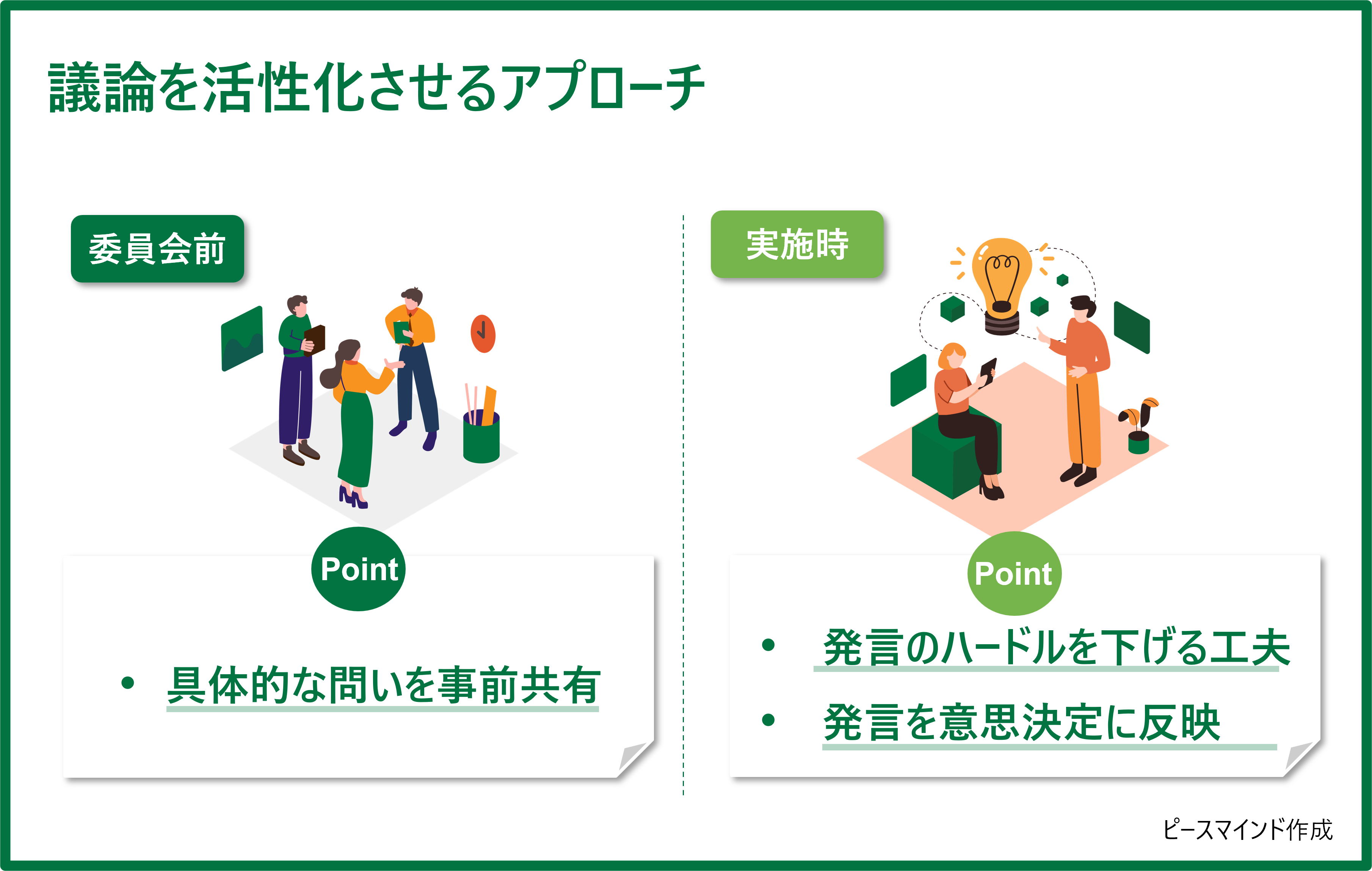 次に、委員会前の短時間面談などを通して、「分からない状態」を肯定し、現場ならではの視点の価値を伝えることが重要です。具体的には、「現場の今の空気感を教えて欲しい」と役割を明確にすることで、発言しやすい土壌を整えます。
