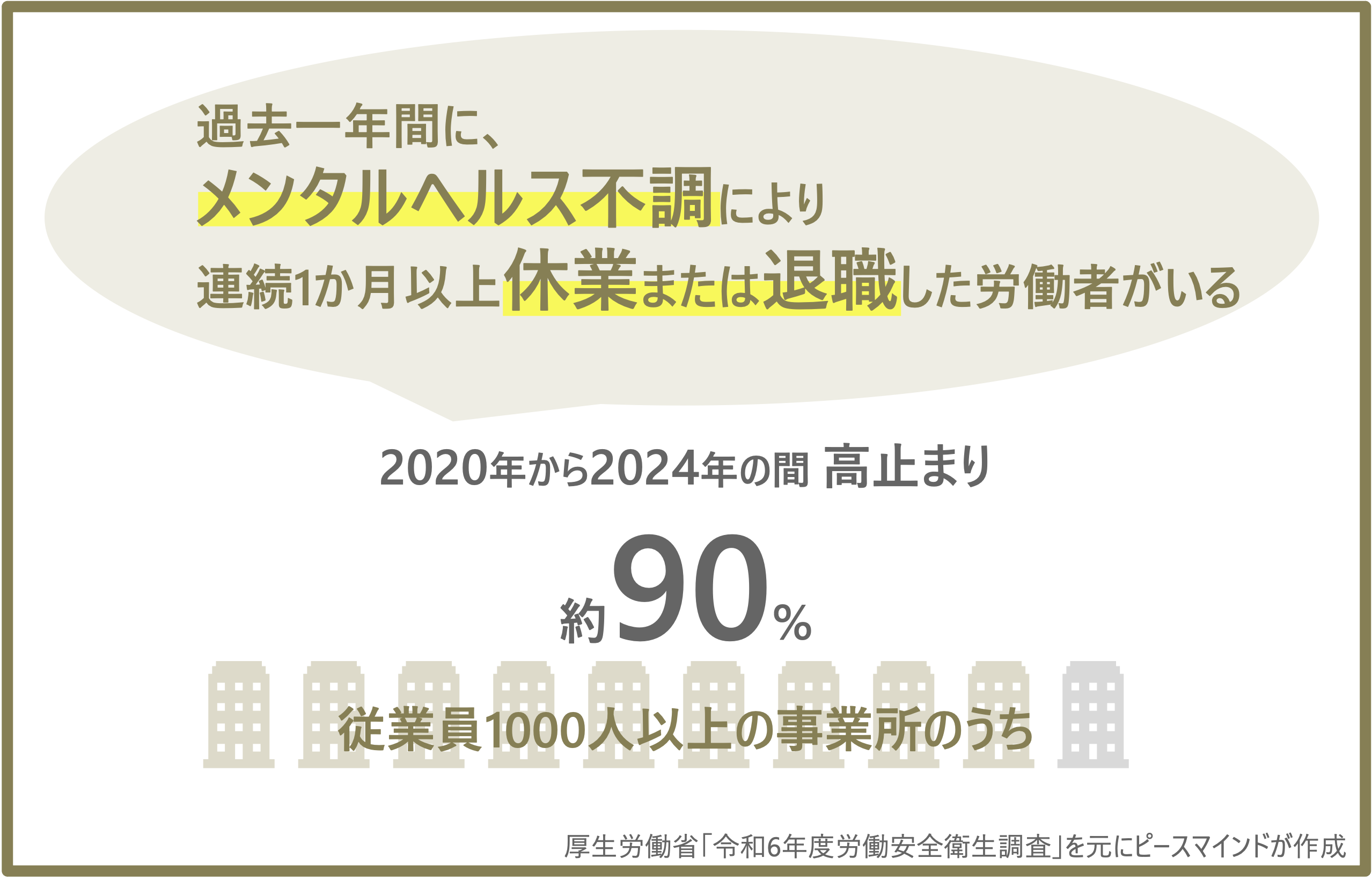 厚生労働省の労働安全衛生調査(※1~5)によると、1,000人以上の事業所のうち過去一年間にメンタルヘルス不調により連続1か月以上休業または退職した労働者の割合は、2020年から2024年の5年間で一貫して90%と高止まりが続いています。また、事業所全体で見ても増加傾向にあることが明らかになっています。