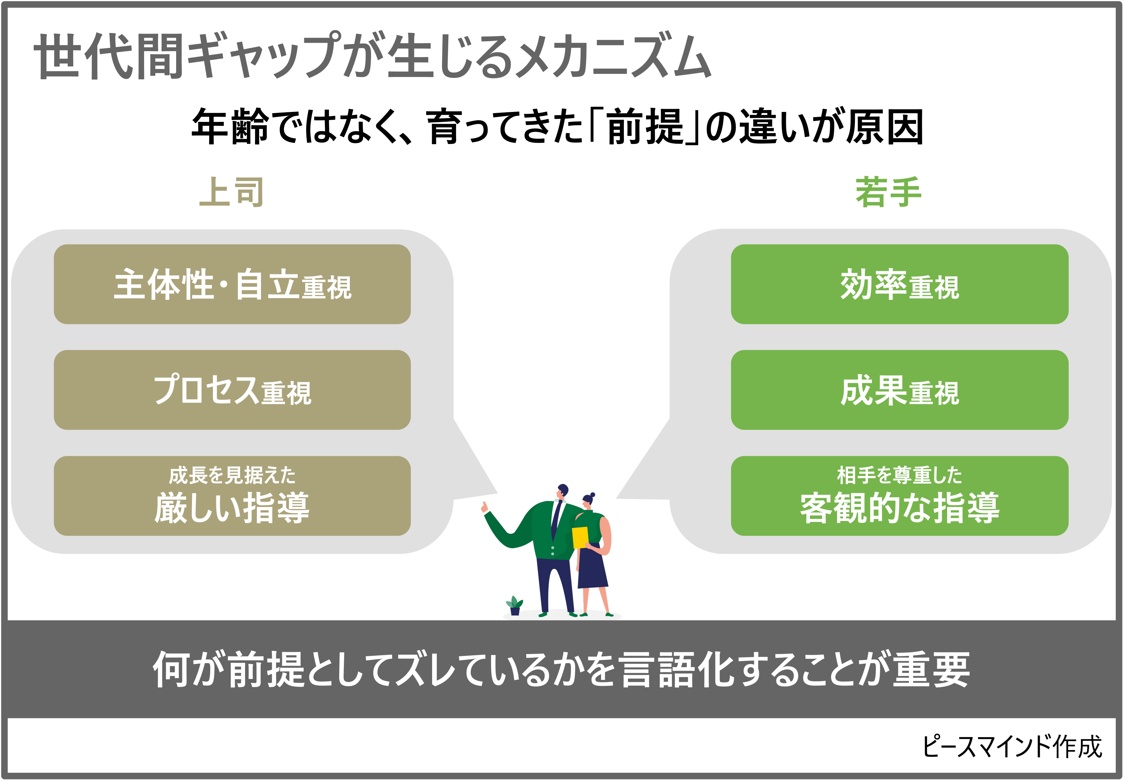 世代間ギャップを語る際に起きやすい誤解が、「若手の理解不足」や「甘え」といった単純化です。もちろん、経験不足による判断ミスは起こり得ます。しかし、問題の本質が「前提の共有不足」や「期待の不明確さ」にある場合、若手だけを責めても状況は改善しません。