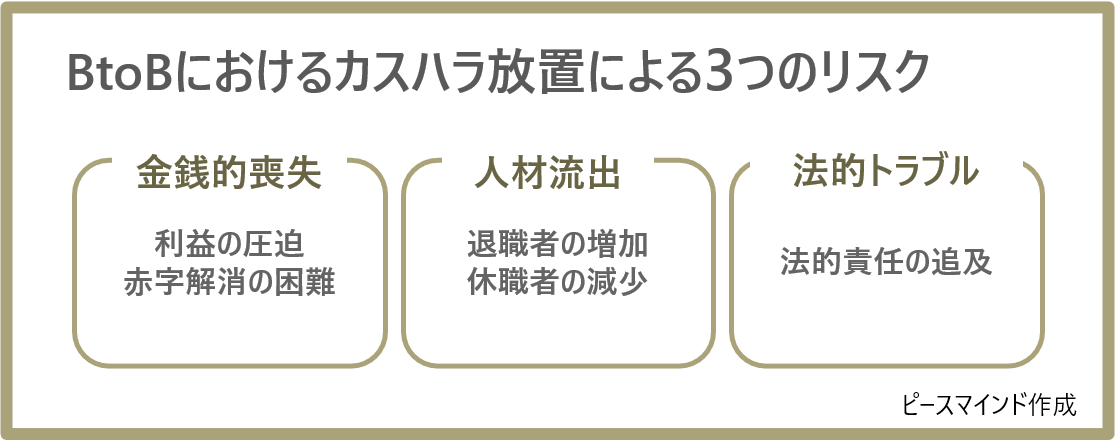 これらのリスクを踏まえると、BtoB領域のカスハラは、採用競争力や企業イメージの低下、事業運営への影響など、企業経営に広範な悪影響を及ぼすことが分かります。そのためBtoB取引においても充分なカスハラ対策を講じることが不可欠です。